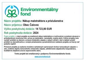 V rámci projektu sa zrealizoval nákup malotraktora s mulčovačom a predným závesom s príslušenstvom (mulčovací klin, príves za malotraktor, rozmetadlo, snežný pluh). Cieľom projektu bolo vyriešiť problém so zberom a zvozom triedeného odpadu z úzkych uličiek v obci.