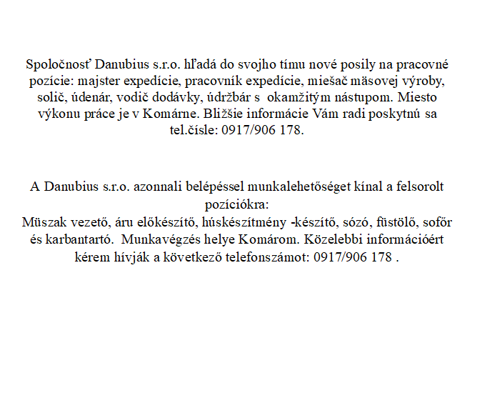Pracovná ponuka / Állásajánlat - Danubius s.r.o.